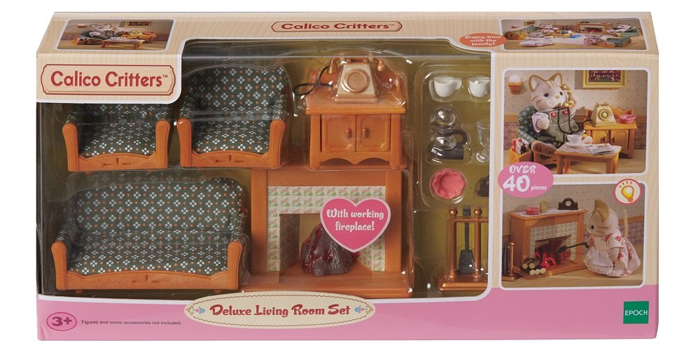 Calico Critters Deluxe Living Room Set. DELUXE LIVING ROOM SET- Calico Critters can cozy up by the fire to spend time with family and friends in this wonderfully detailed living room set. The ensemble includes a light up fireplace (AAA batteries not included), accessories and more!